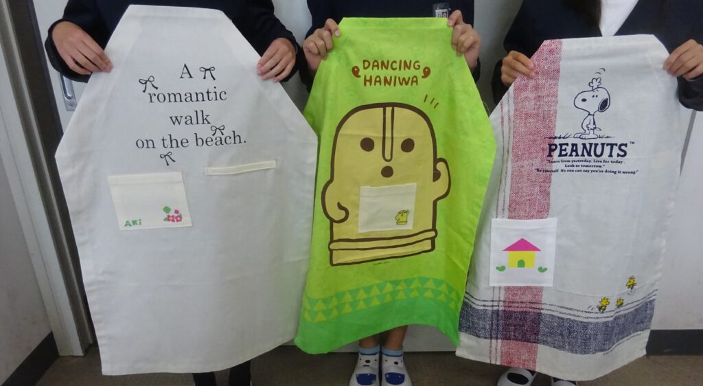 後日、ポケットを付けて、アップリケをして、オリジナルのエプロンが完成しました。